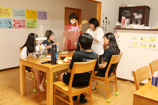 1ユニット6人ほどの子どもと担当職員が寝食を共にしています。地域共生を理念にかかげて運営しています。