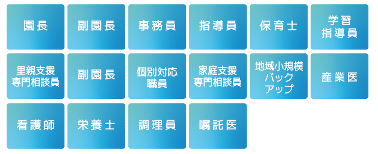 園長、副園長、事務担当、自立支援担当職員、里親相談員、看護士、心理士